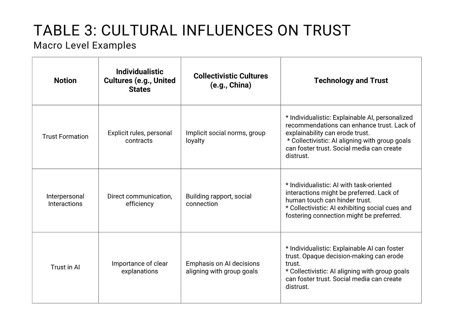 The following section will explore how these cultural differences influence interpersonal interactions and how technology can further impact trust formation in AI-mediated interactions.