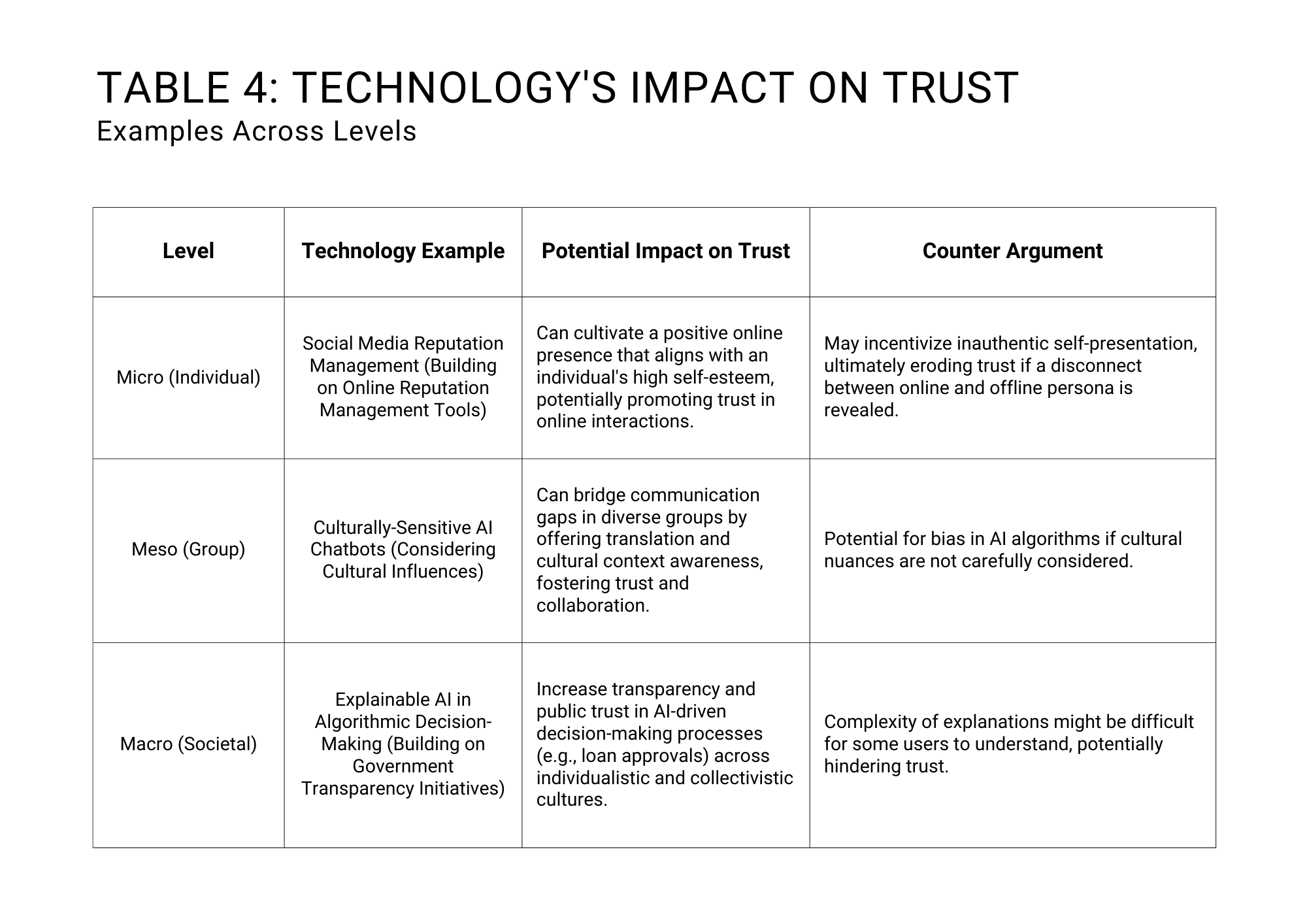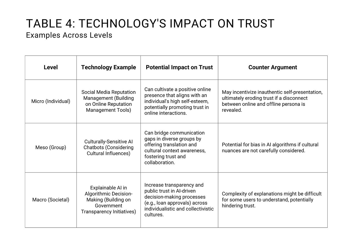 With much humility, further research is necessary to fully understand the interplay between technology and trust. How do leadership styles and group norms influence trust within groups? Can technology applications be designed to mitigate cultural biases and promote trust across diverse populations? Addressing these questions can ensure that technology that is developed continues to be an enabler of trust and collaboration for this global society.
