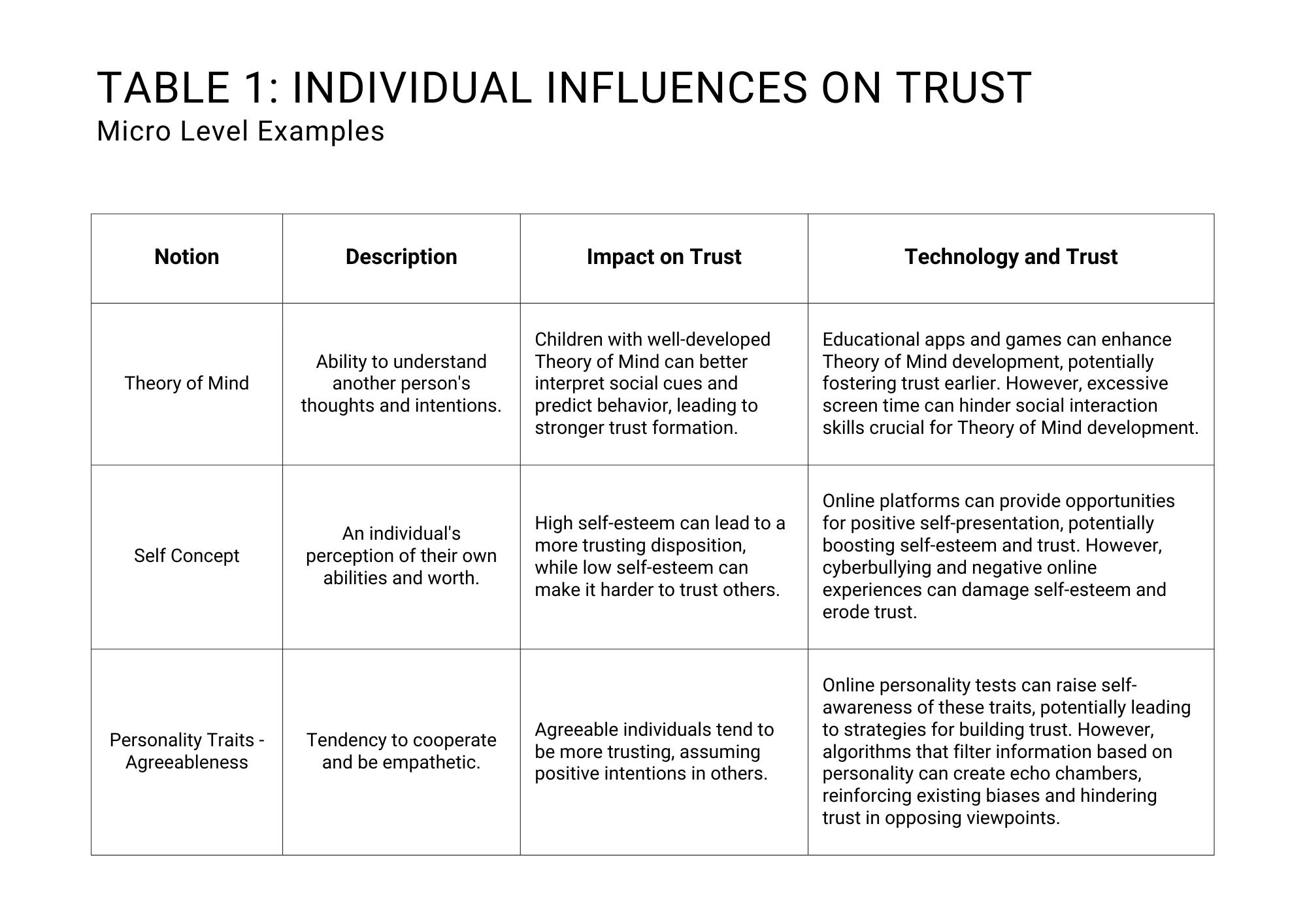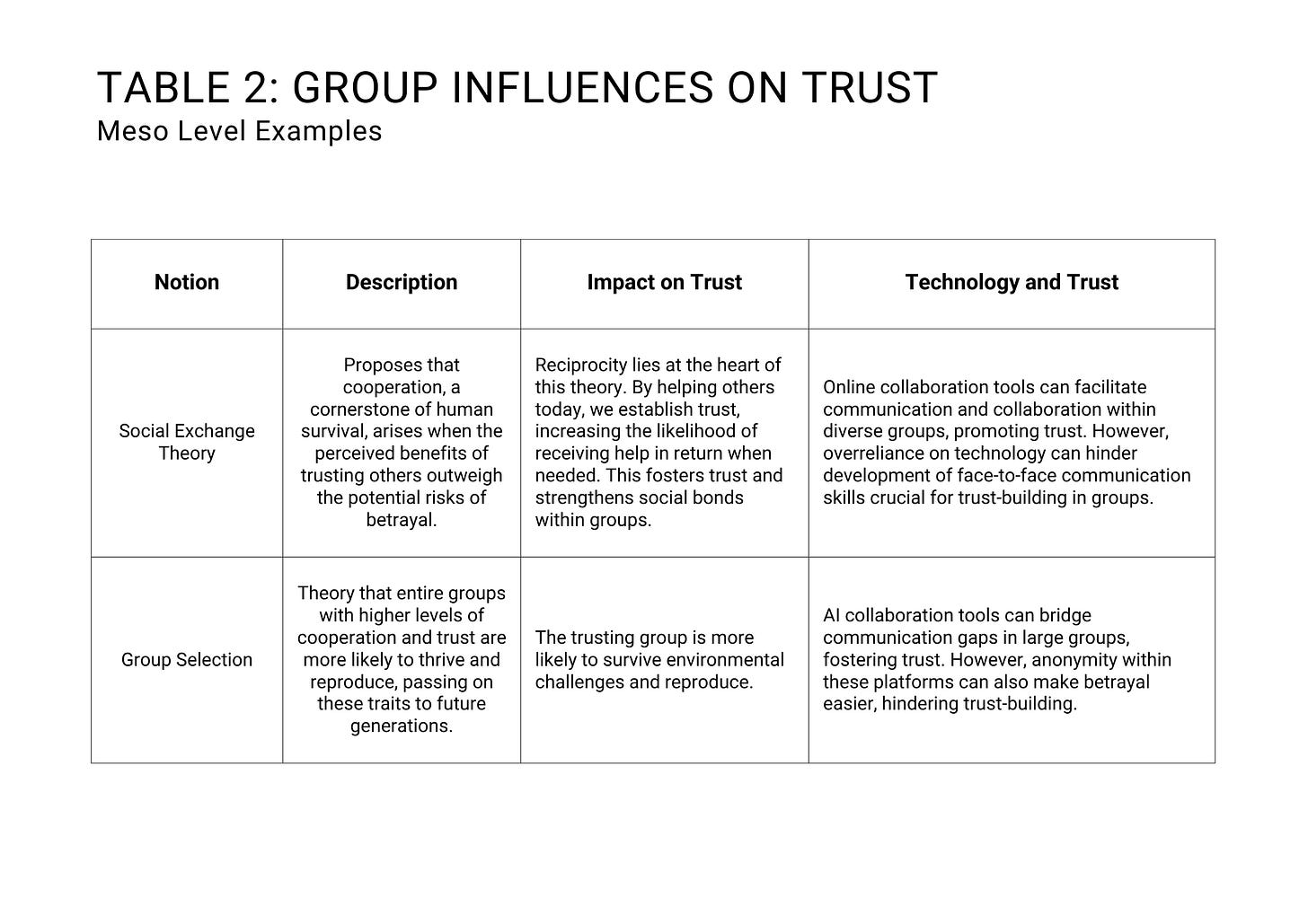 At the micro level our ability to understand the thoughts and intentions of others, known as Theory of Mind, plays a crucial role in building trust-based relationships. Additionally, personality traits and self-esteem influence our likelihood to trust. Moving to the meso level, group dynamics come into play. Cooperation, as highlighted by Social Exchange Theory, and the evolutionary advantage of trust within groups, demonstrated by Group Selection, are essential considerations. Finally, at the macro level, cultural values significantly shape how trust is built. Individualistic societies often emphasize explicit rules and personal contracts, while collectivistic societies prioritize group harmony and social well-being.